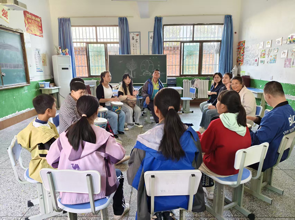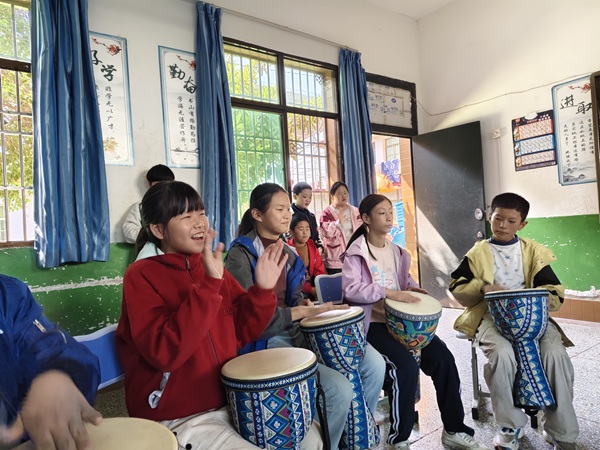 孩子们为我们表演了节目,当《布谷鸟》的音乐旋律在教室中响起,孩子们跟着老师的节奏轻拍小鼓,随音乐摇晃,有的闭眼沉浸,有的睁大好奇的眼睛观察同伴,不时发出银铃般的笑声,教室里洋溢着活力与欢乐。歌词中“把一切都忘掉,要飞到天涯海角,我是勇敢的小鸟”,就像是孩子用另一种方式告诉我们,他们心中最纯真的渴望与期待,他们或许表达有限,却用最本真的方式诠释着快乐与自信。